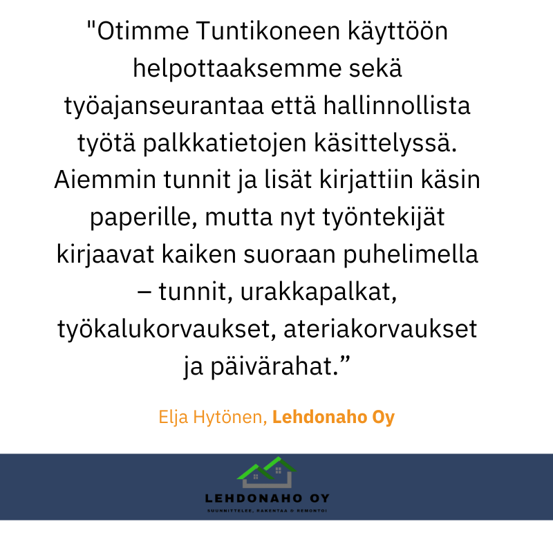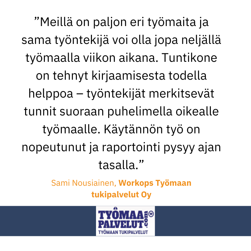 Tuntikone on suomalainen, helppokäyttöinen ja edullinen ohjelmisto työajanseurantaan. Saat lakisääteisen työajanseurannan hoidettua vaivattomasti missä vain kuljetkin ja minimoit virheet palkanlaskussa. Kun työajanseuranta on helppoa, voit keskittyä siihen mikä saa teidät menestymään.